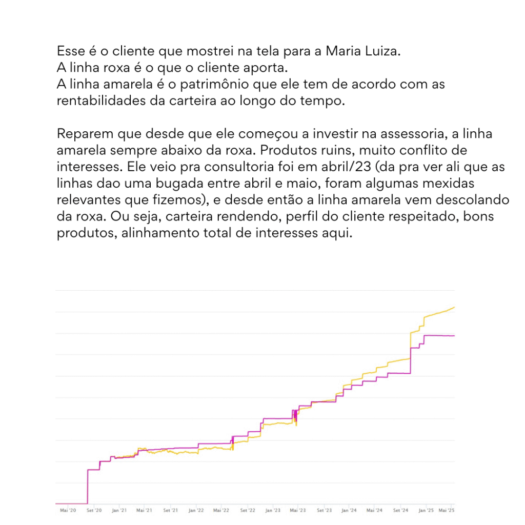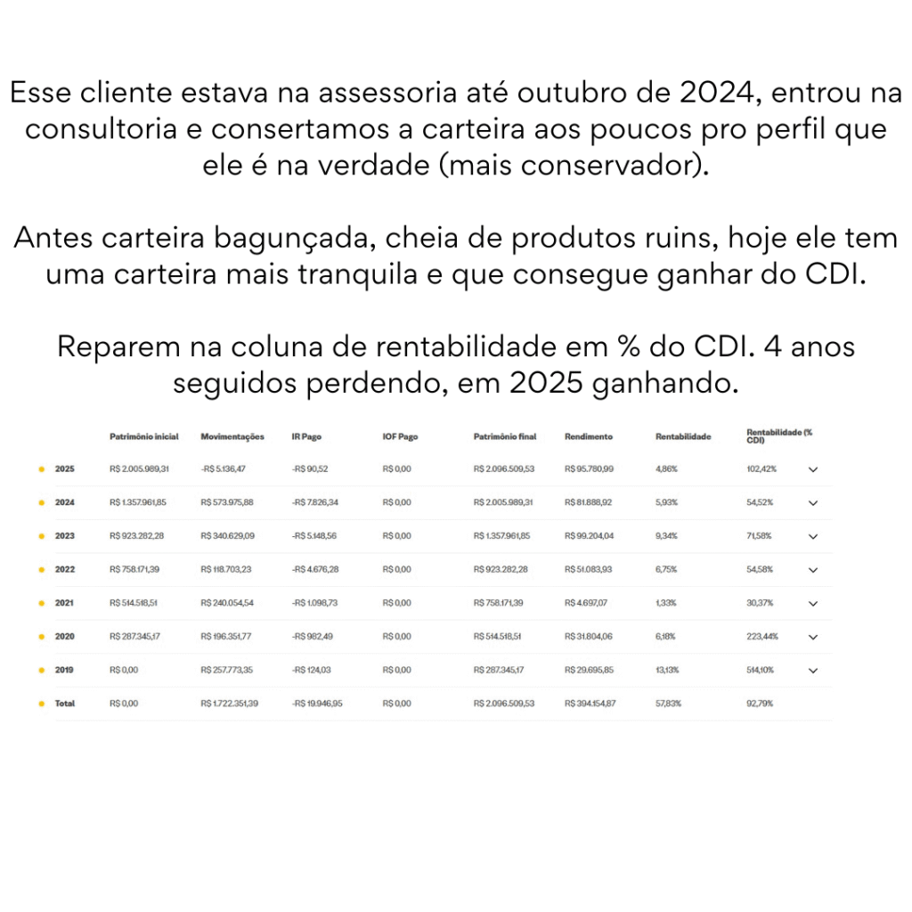 Rompeu com o modelo que prioriza a venda de produtos e criou sua própria mentoria, sem conflito de interesses, focada em independência financeira sólida, segura e de longo prazo.